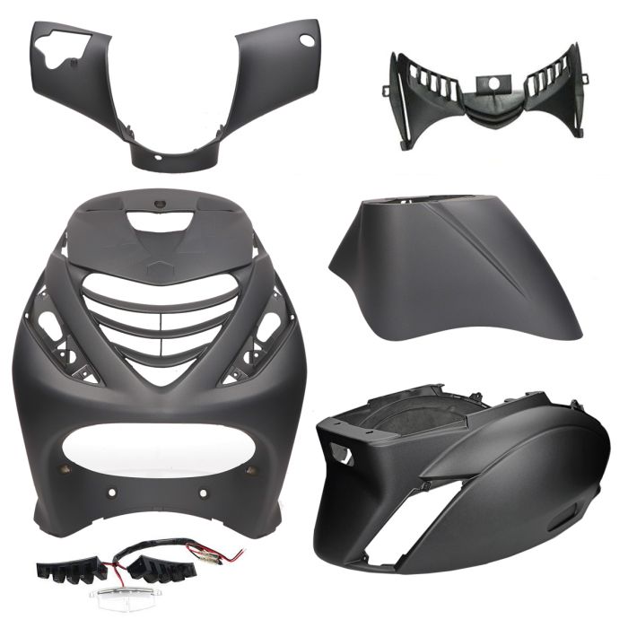 This 6-piece fairing kit is specifically designed for Piaggio Zip models from 2000 onwards, both 2-stroke and 4-stroke. Made from high-quality plastic with a sleek matte anthracite finish, this set gives your scooter a modern, sporty look.