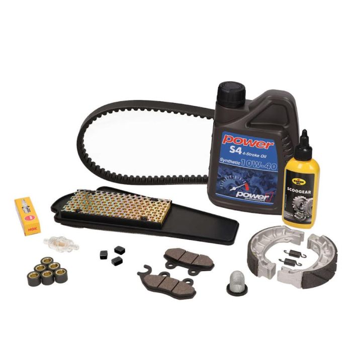 • Spark plug Ngk • Air filter element Endurance • Variator Roles Endurance • Variator guides Endurance • Bando V-belt • Valvoline oil • Transmission Oil Crown • Fuel filter Endurance • Rear brake shoes Original • Brake pads for Endurance • Oil filter Weight variator rollers 25km/h: 8.5 grams Weight of variator rollers 45km/h: 5.7 gramsEndurance Maintenance Kit