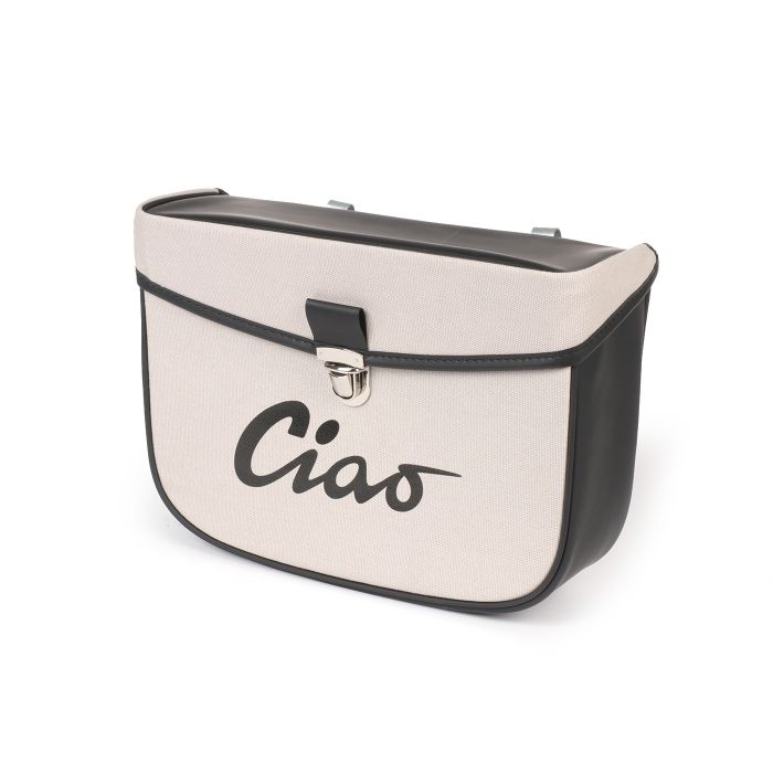 Beautiful saddle bag from Moto Nostra, which is easily attached to the side of the luggage rack of your Ciao by means of two hooks and a spring. It offers plenty of storage space and stays, thanks to reinforcement, always in shape. The lid and sides are made of waterproof PVC, while the front is made of canvas with printed Ciao lettering. Important utensils like wallet, sunglasses, keys, papers, tools and oil finally find enough space here.