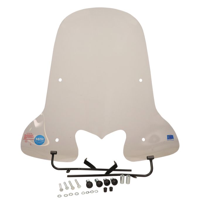 With a windshield on your Kymco People S, you will suffer much less from annoying insects or wind in your eyes. In addition, you will stay considerably drier in rainy weather when you are behind a high windshield. Even in colder weather, a windbreak for the Kymco People S has advantages, because you notice less of the cold driving winds. In addition to all the above practical advantages, a high windshield also gives your Kymco People S a characteristic retro look. The windshield also comes with a mounting kit.Mounting your Kymco People S windshield.